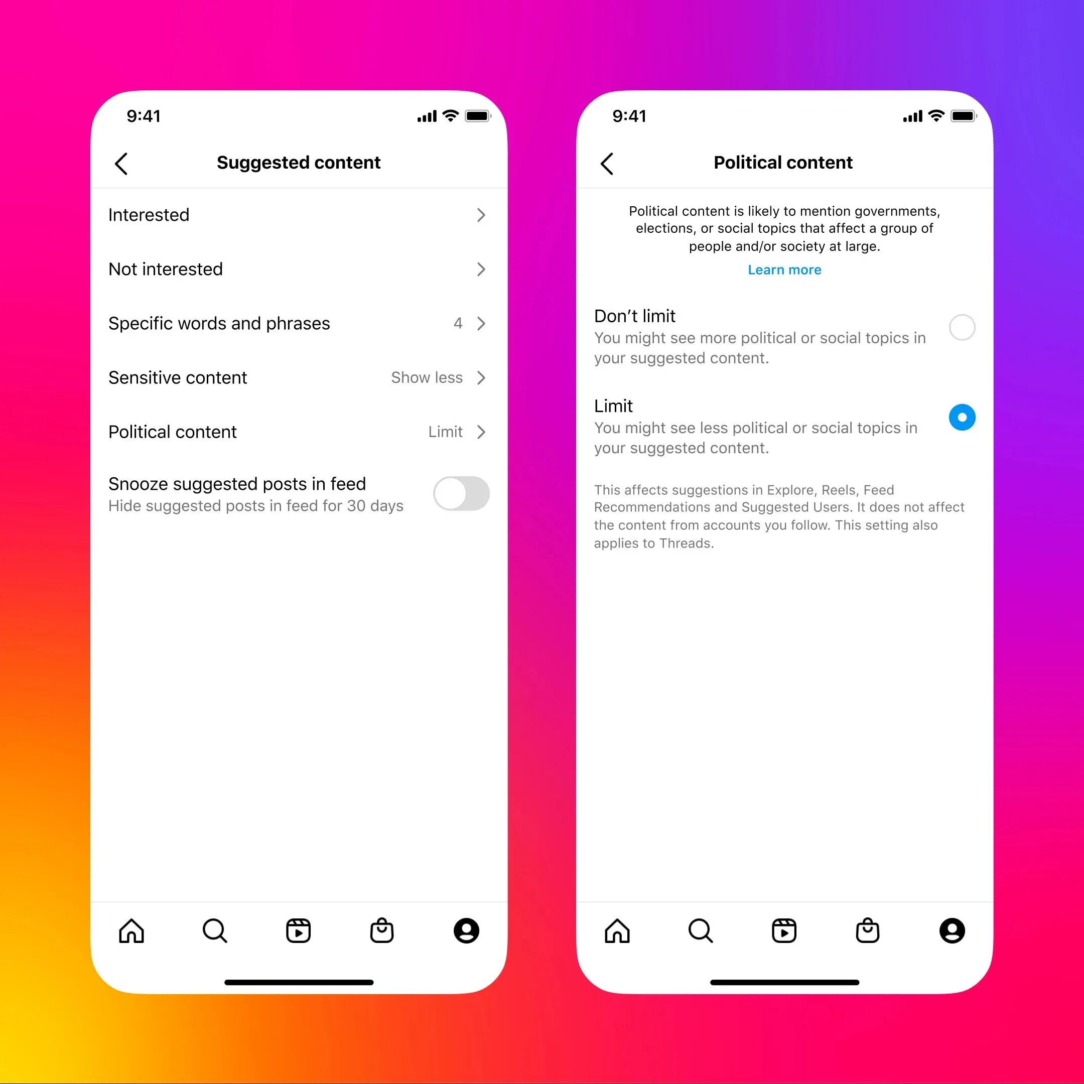 Les changements s’appliqueront aux comptes publics lorsqu’ils sont activés et uniquement dans les endroits où le contenu est recommandé, comme Explorer, Reels, les recommandations dans le fil d’actualité et les utilisateurs suggérés. La mise à jour ne modifiera pas la façon dont les utilisateurs voient le contenu des comptes qu’ils choisissent de suivre, donc les comptes non éligibles à être recommandés peuvent toujours poster du contenu politique à leurs abonnés via leur fil d’actualités et leurs Stories.