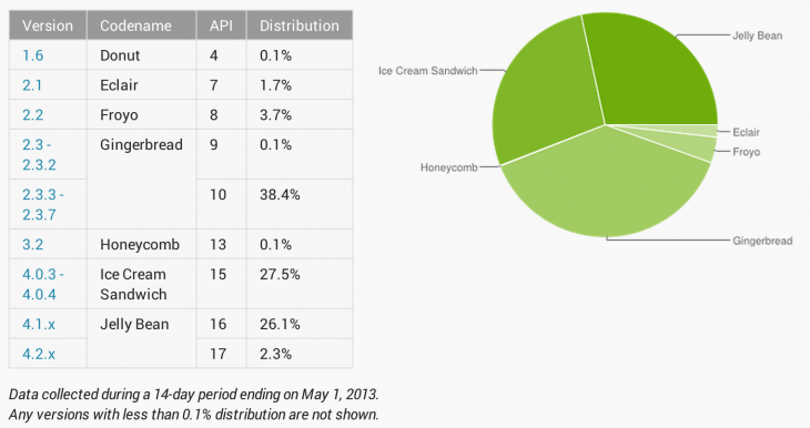 Comme il est de tradition à chaque début de mois, Google a publié ses chiffres mensuels pour l’adoption des versions Android, en mettant à jour sa page Web qui recense le pourcentage d’adoption de telle ou telle version de l’OS mobile. Avec Android 4.2 (Jelly Bean) et Android 4.1 (Jelly Bean) qui grimpe de 3,4% atteignant ainsi les 28,4% des dispositifs actifs, Android 4.0 (Ice Cream Sandwich) quant-à lui recule de 1,8%, le faisant passer à 27,5% d’adoption. Après être tombé sous la barre des 40% le mois dernier, Android 2.3 (Gingerbread) a de nouveau chuté pour arriver à 38,5% d’adoption. Pendant ce temps, Froyo et Eclair semble être devenu vraiment obsolète avec respectivement 3,7% et 1,7% de parts de marché, tandis que Donut ne dispose plus que d’un 0,1% d’adoption.