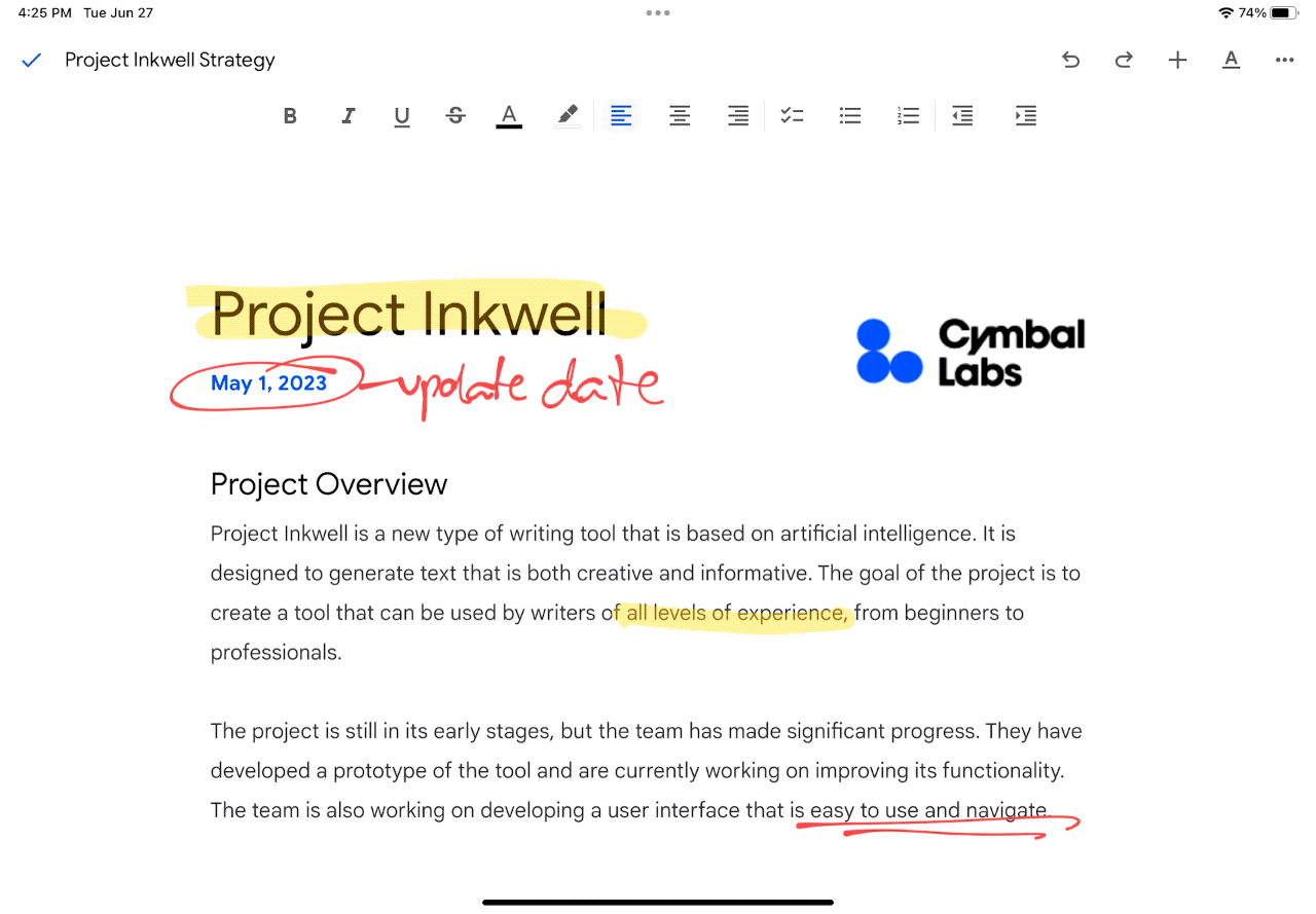 Cette fonctionnalité vous permet d’ajouter des annotations manuscrites à l’aide d’un stylet ou d’un doigt sur les appareils Android. Les annotations peuvent s’avérer plus utiles que les annotations classiques dans Google Documents, notamment lorsque des collègues font part de leurs commentaires sur des diagrammes et des rapports, que des enseignants commentent le travail de leurs élèves ou que des propriétaires communiquent des mises à jour sur les travaux de construction à leurs entrepreneurs.