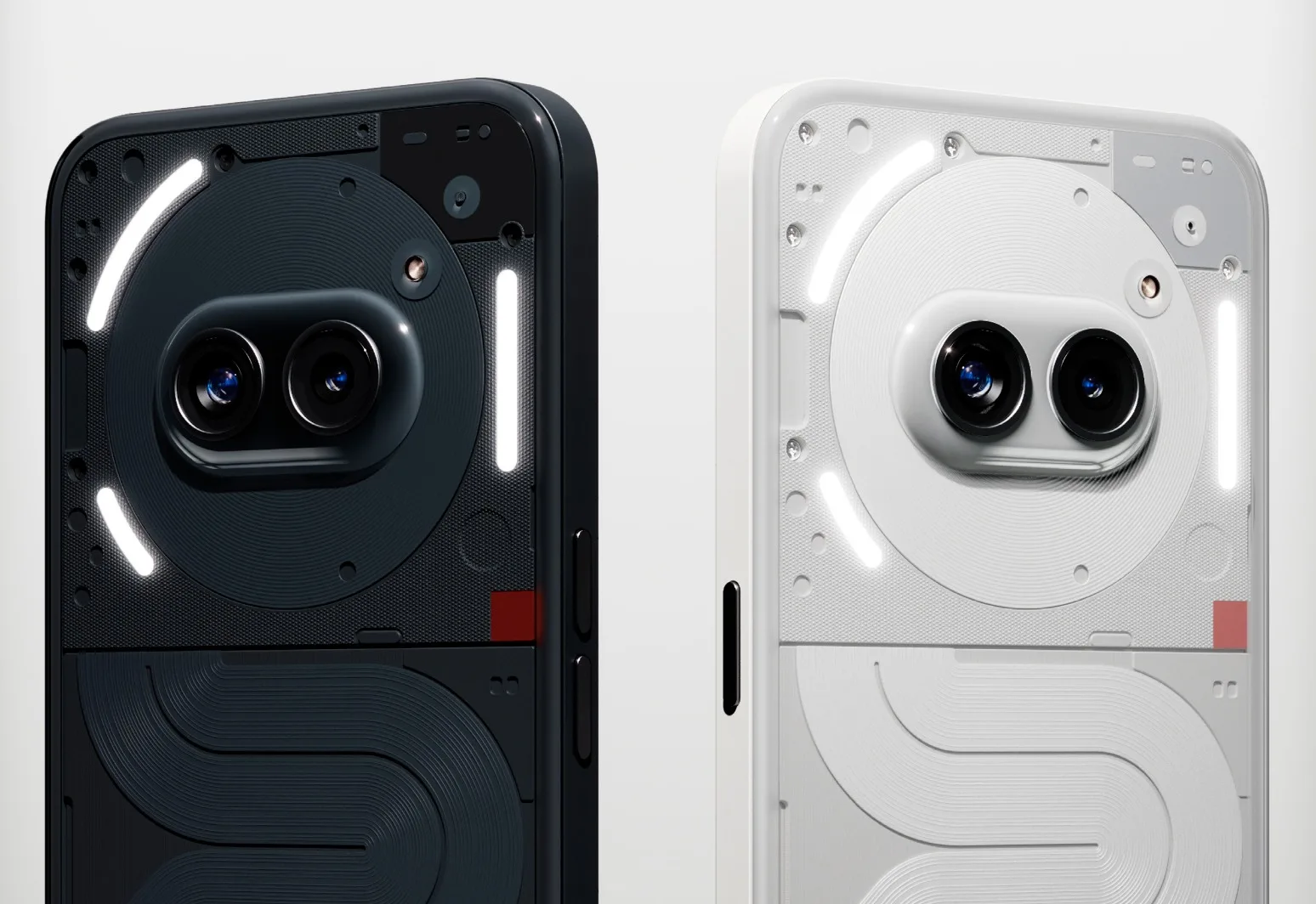 Le matériau utilisé pour le dos transparent est le polycarbonate, en d’autres termes, le plastique. Le cadre est également en plastique, mais les boutons sont en aluminium. Le smartphone est disponible en deux coloris — blanc et noir ; le plastique du dos s’arrondit sur les bords et présente une sorte de finition givrée. Dans le style typique de Nothing, les boutons de volume se trouvent à gauche, tandis que le bouton d’alimentation se trouve à droite.