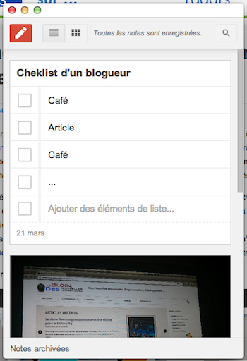 Comme le mentionne Eddy Mead, ingénieur logiciel chez Google, dans un billet de blog, “l’application Chrome Google Keep lance sa propre fenêtre, de sorte que vous pouvez créer des notes, de rayer de vos listes les choses à faire, et joindre des photos à des tâches pendant que vous travaillez sur autres choses”. De plus, si vous n’avez pas une connexion Internet, ne vous inquiétez pas l’application Chrome fonctionne hors-ligne, “car nous savons tous que les idées (petites et grandes) peuvent survenir à tout moment”, souligne Eddy.