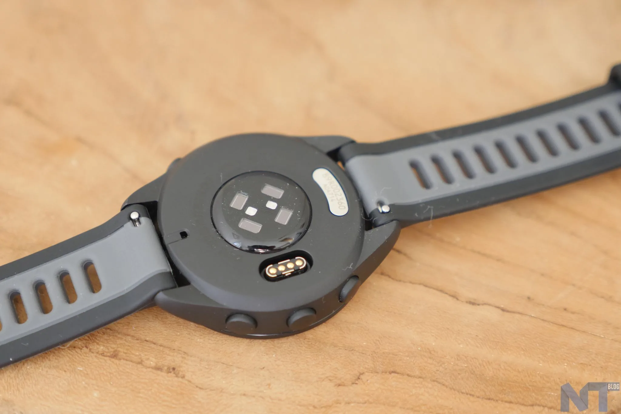 Elle est équipée d’un bracelet bicolore qui est fantastique et un peu plus sophistiqué qu’un bracelet uni. Ayant testé des montres connectées pendant des années, je trouve les bracelets Garmin les plus confortables parmi toutes les montres que j’ai testées. La Forerunner 165 et les autres montres Garmin utilisent des bracelets standard à ressort, donc ils ne sont pas aussi rapides à échanger que ceux d’une Apple Watch, mais ils sont universels et vous avez un choix infini à sélectionner.