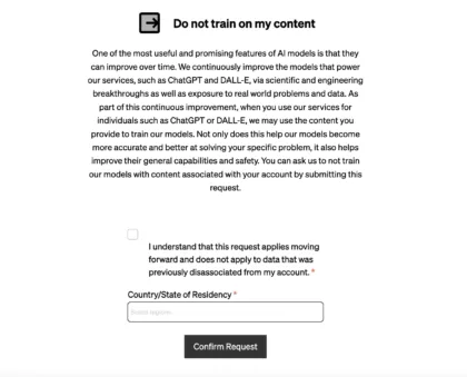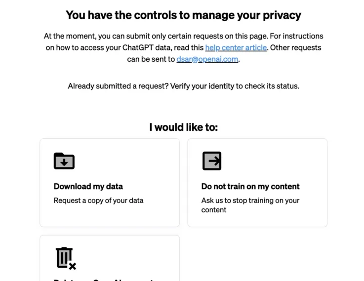 J’ai lancé la page du portail de confidentialité d’OpenAI où j’ai déposé une demande d’arrêt de l’entraînement sur mon contenu. OpenAI vous enverra un e-mail. Cliquez sur le lien que vous recevez dans votre e-mail et déposez la demande. Les utilisateurs gratuits et les utilisateurs de ChatGPT Plus peuvent déposer cette demande.