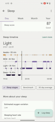 En outre, vous pouvez désormais appuyer sur le graphique de la chronologie du sommeil et le maintenir enfoncé pour savoir à quelle heure vous vous êtes réveillé la nuit dernière ou quand votre sommeil profond s’est terminé.