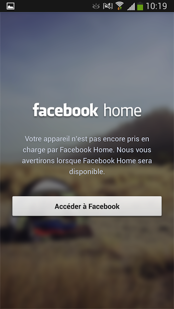 Alors que j’ai pu installer l’application sans aucun problème, dès lors que je veux lancer celle-ci un message apparaît comme quoi l’appareil donc je dispose – Galaxy S4 – “n’est pas encore pris en charge par Facebook Home”. Je suppose que nous devons donc patienter, ou attendre une mise à jour de l’application.