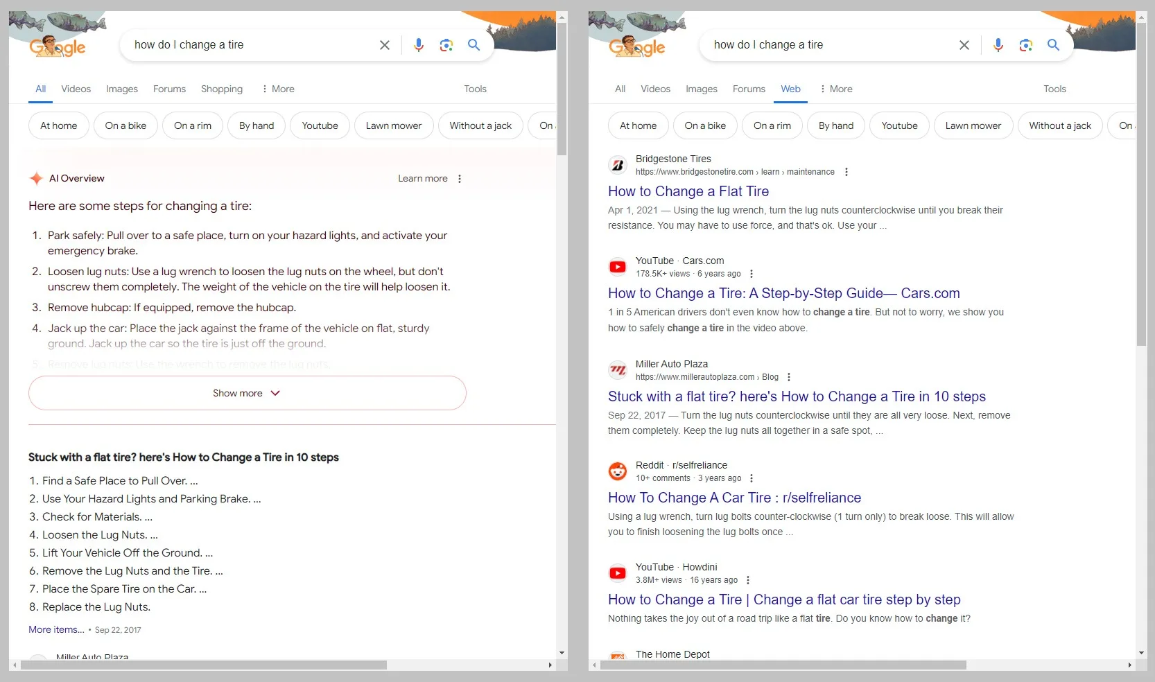 AI Overview occupe une place de choix en haut des résultats, repoussant les liens Web traditionnels plus bas dans la page. La première page de résultats se compose de la boîte IA et d’une réponse issue d’un site Web. La deuxième page propose des questions analogues et des vidéos, et il faut descendre jusqu’à la quatrième page pour retrouver les traditionnels 10 liens bleus.