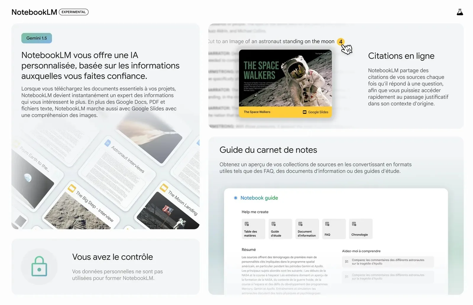 Avec le nouvel Notebook Guide, NotebookLM lit les sources et crée des guides d’étude, des FAQ ou des documents de briefing. Les citations en ligne peuvent renvoyer à vos propres sources pour vérifier les réponses de l’IA — jusqu’à 50 sources par « carnet » ou projet, et chaque source peut contenir jusqu’à 500 000 mots. Auparavant, il était possible de télécharger uniquement cinq sources.
