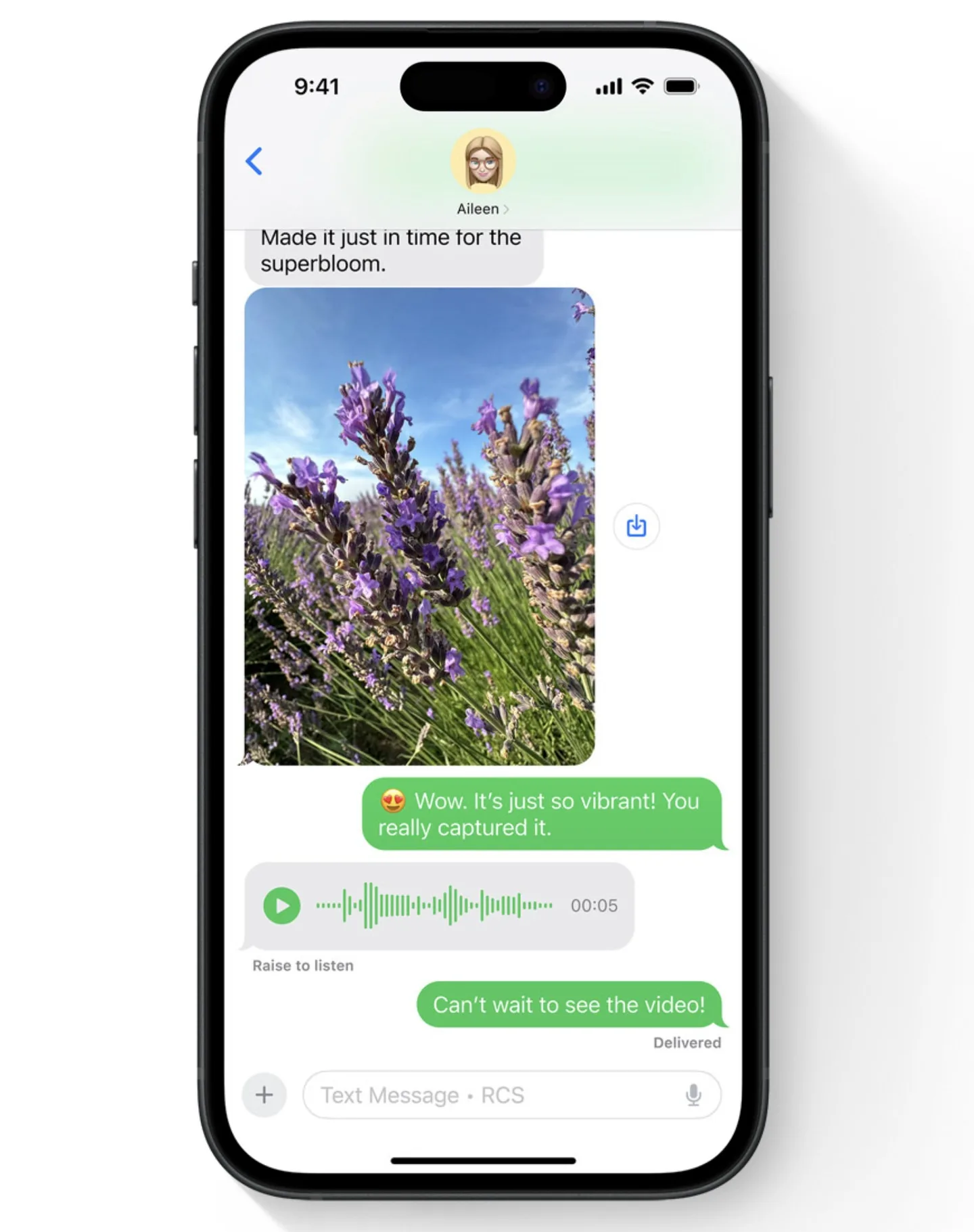 Malheureusement, nous ne savons pas grand-chose d’autre que le fait que cette norme sera intégrée à iOS 18. Le site Web d’Apple consacré à la prochaine version contient au moins un exemple de l’aspect que prendra le RCS sur les iPhone. « RCS » apparaît dans le champ de texte pour indiquer une connexion, mais pour le reste, c’est tout à fait standard.