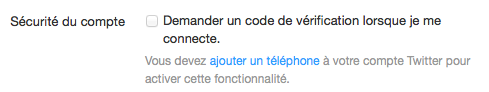 La page des paramètres du compte s’ouvrira et tout ce que vous avez à faire à partir de celle-ci, est de faire défiler vers le bas la page où vous trouverez l’option “Sécurité du compte”. Cochez la case à côté de “Demander un code de vérification lorsque je me connecte”. Il est important de noter que si vous ne pouvez la cocher, c’est tout simplement que vous n’avez pas renseigné un téléphone à votre compte Twitter.