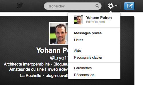 Le système d’authentification en deux étapes que Twitter déploie est le même système que j’avais pu vous rapporter le mois dernier. Du point de vue de l’utilisateur, le système est assez simple. Dans un premier temps, vous aurez besoin de l’activer. Pour ce faire, il suffit de se rendre sur l’icône d’engrenage en haut de la page sur votre compte et cliquez sur “Paramètres” dans le menu déroulant.
