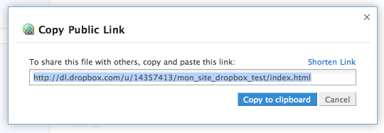 Ainsi mon URL, http://dl.dropbox.com/u/14357413/mon_site_dropbox_test/index.html, donné par Dropbox se résume à : http://tourl.fr/apnm. Beaucoup plus simple non ?