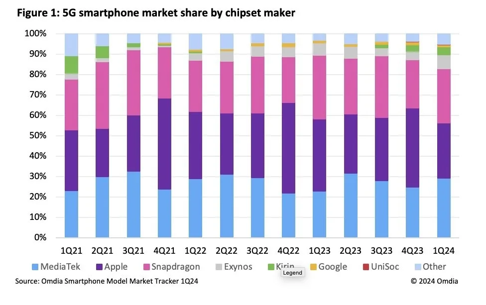 Le marché des smartphones 5G n’est pas uniquement dominé par MediaTek et Snapdragon. D’autres fabricants de chipsets tels que Exynos, Google, Kirin et UniSoC représentent collectivement 17 % des expéditions. Cette part a augmenté au cours de l’année écoulée, en grande partie grâce à la croissance des chipsets Kirin, notamment avec les séries Huawei Mate 60 Pro et Nova 12.