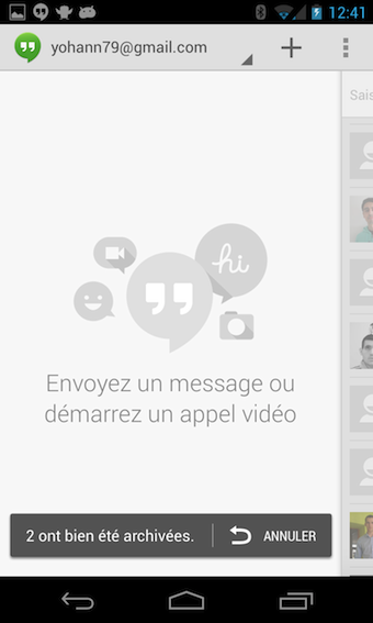 Quand vous entrez dans un Hangout, que ce soit en mode vidéo ou texte, on pourra tout apprécier l’expérience de Google Hangouts. Mais, comme le reste de cette application celle-ci pourrait être meilleure. La liste des contacts est un gâchis inexplicable et il semble y avoir des fonctionnalités manquantes qui différencie vraiment Hangouts des autres services de chat.