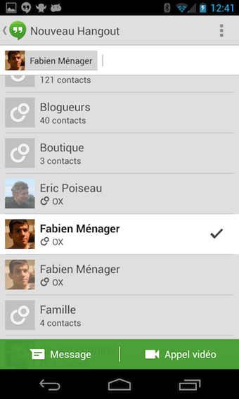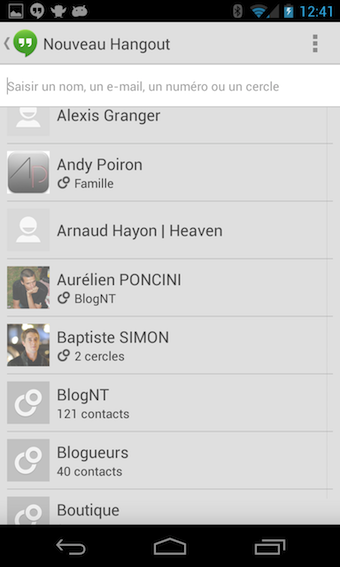 À l’heure actuelle, Hangouts est un service de messagerie et de chat vidéo entre les utilisateurs de Google. Vous devez nécessairement avoir un compte Google+ Hangouts afin de l’utiliser, ce qui peut rebuter certaines personnes, même s’il n’est pas particulièrement difficile de se créer un compte. L’application Hangouts vous permet de réaliser une conversation avec jusqu’à dix utilisateurs, soit à partir de votre carnet d’adresses ou de vos cercles Google+. L’écran de sélection pour choisir les gens à discuter est un peu déroutant, puisque certains utilisateurs sont répertoriés avec des photos en haut de l’écran et le reste de vos contacts sont sous forme de liste en bas. Si j’ignore la raison, je suppose que ceux en haut sont les plus récents ou les plus probables partenaires enclin à discuter, mais je ne suis pas vraiment sûr. Il y a une fonction de recherche – c’est bien le point fort de Google après tout – si nécessaire, qui vous permet de simplement taper le nom de votre contact.