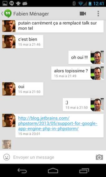 Une fois que vous êtes dans une conversation, vous pouvez converser avec vos partenaires via des messages au format texte (avec les emojis), des photos ou de la vidéo. Les textes se rafraîchissent en temps réel et contrairement à ce que l’on connaissait aujourd’hui avec le service de messagerie de Google, Hangouts conserve une archive de vos conversations afin que vous puissiez revenir en arrière sur une longue période de temps.