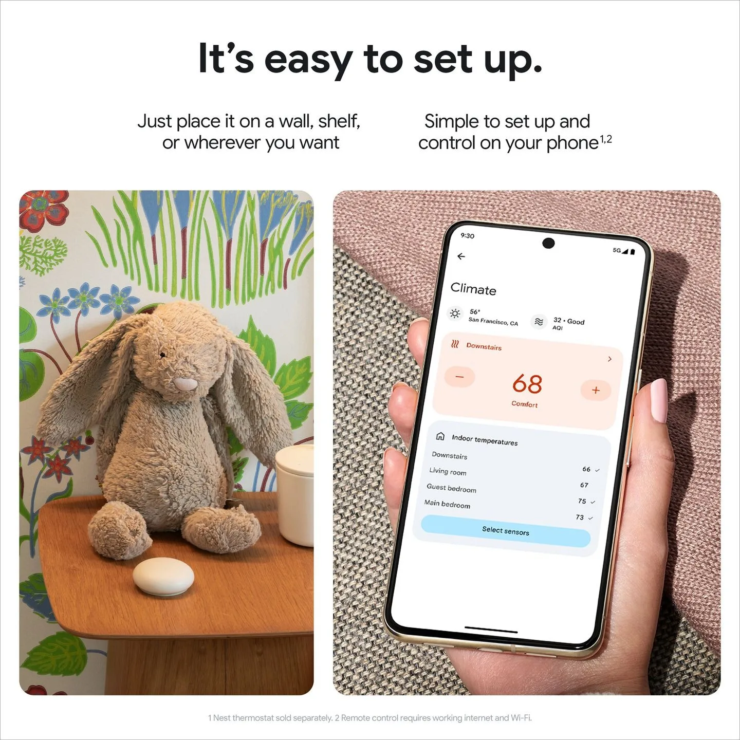 Le thermostat fonctionne avec un capteur de température Nest de seconde génération redessiné, qui peut être incrusté au mur ou placé sur une table. Ces capteurs, au prix de 39 dollars chacun ou 99 dollars pour trois, ont une autonomie de trois ans. Bien qu’ils n’aient pas encore de marque Nest, ils sont plus ronds et plus souples que les modèles actuels.