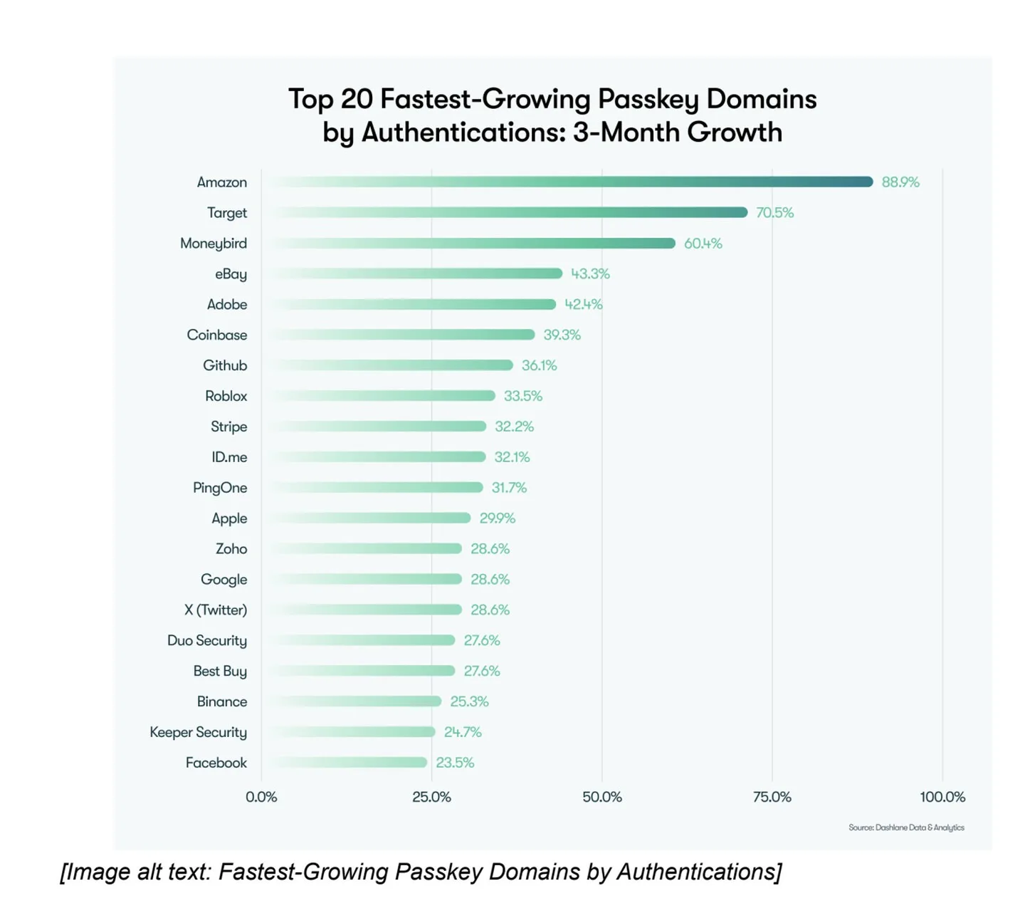 Amazon, Target et eBay figurent parmi les quatre premiers domaines à la croissance la plus rapide en matière de passkeys depuis le deuxième trimestre de 2024. Cela met en évidence l’importance cruciale des sites de commerce électronique dans cette adoption.