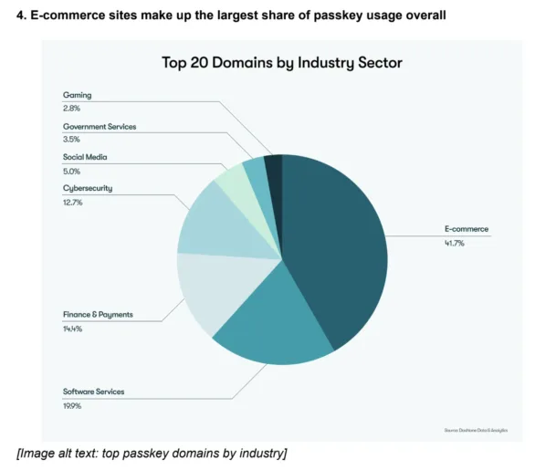 Lorsqu’on analyse l’adoption des passkeys par industrie, le commerce électronique représente 41,7 % des sites, suivi des services logiciels à 19,9 % et de la finance et des paiements à 14,4 %. Dashlane cite une étude de la FIDO qui indique que le consommateur américain moyen abandonne un achat ou cesse d’utiliser un service en ligne environ 4,76 fois par jour en raison de l’oubli de mots de passe. En introduisant un accès sans mot de passe, les sites Web peuvent récupérer des revenus perdus.