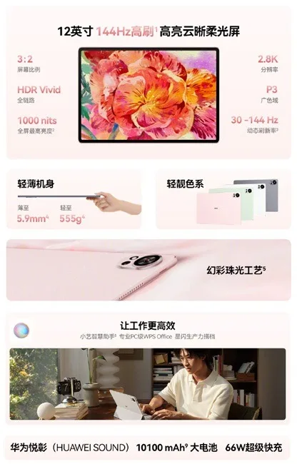 Sous HarmonyOS 4.2, la tablette inclut des fonctionnalités AI dans l’application Celia pour l’écriture, la gestion de documents et des applications de niveau PC. L’application Notes mise à jour propose des couvertures créatives, des autocollants et des outils AI, tout en supportant des applications de niveau PC comme WPS Office et Edraw Icons.