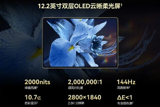 Cette tablette est équipée d’un écran OLED à double couche de 12,2 pouces avec une résolution de 2800 x 1840 pixels, un taux de rafraîchissement de 144 Hz, un ratio écran-corps de 92 %, un contraste de 2 000 000:1 et une luminosité maximale de 2000 nits. Elle supporte 1,07 milliard de couleurs, une large gamme de couleurs P3 et une précision des couleurs ΔE < 1, réduisant 99 % des interférences lumineuses grâce à la technologie PaperMatte.