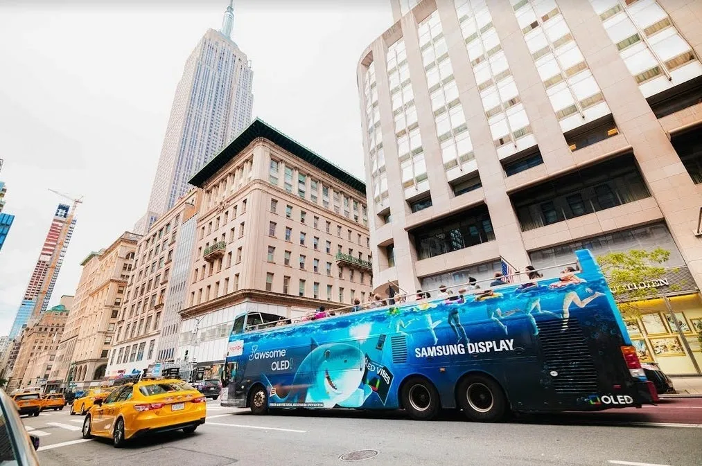 Samsung Display a récemment lancé une campagne publicitaire impressionnante à New York pour promouvoir ses écrans OLED, attirant l’attention des habitants et des touristes pendant les chauds jours d’été. Jusqu’au 5 septembre, les célèbres bus touristiques de la ville arboreront une publicité accrocheuse mettant en avant les écrans OLED de Samsung. Sur l’affiche, un requin souriant tient un smartphone tri-pliable avec l’inscription « OLED Vibes » affichée sur l’écran, accompagnée du slogan « Jawsome OLED ».