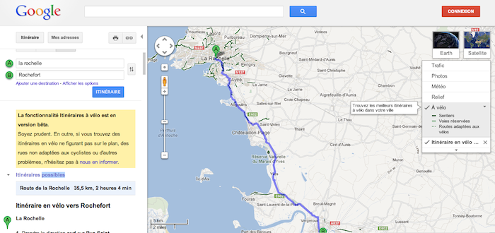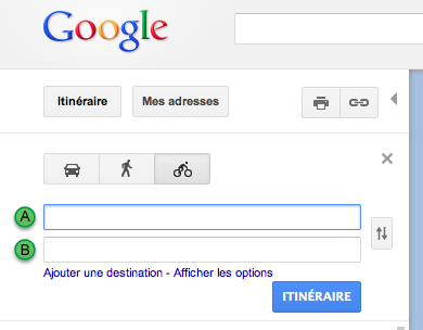 Pour tirer profit de la navigation en vélo, il suffit d’aller sur Google Maps, et de cliquer sur le bouton “Itinéraire”, puis sélectionnez l’icône représentant un cycliste. Il suffit d’entrer votre point de départ et d’arriver et le tour est joué !