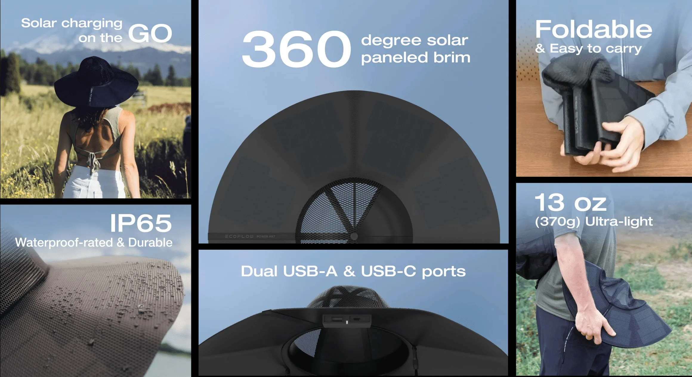 Avez-vous déjà eu envie de porter 8 panneaux solaires sur votre tête ? Moi non plus, mais c’est pourtant l’expérience que propose EcoFlow. Le grand chapeau peut capter les rayons sous tous les angles avec une couverture de 360 degrés, vous protégeant du soleil et collectant de l’énergie simultanément.