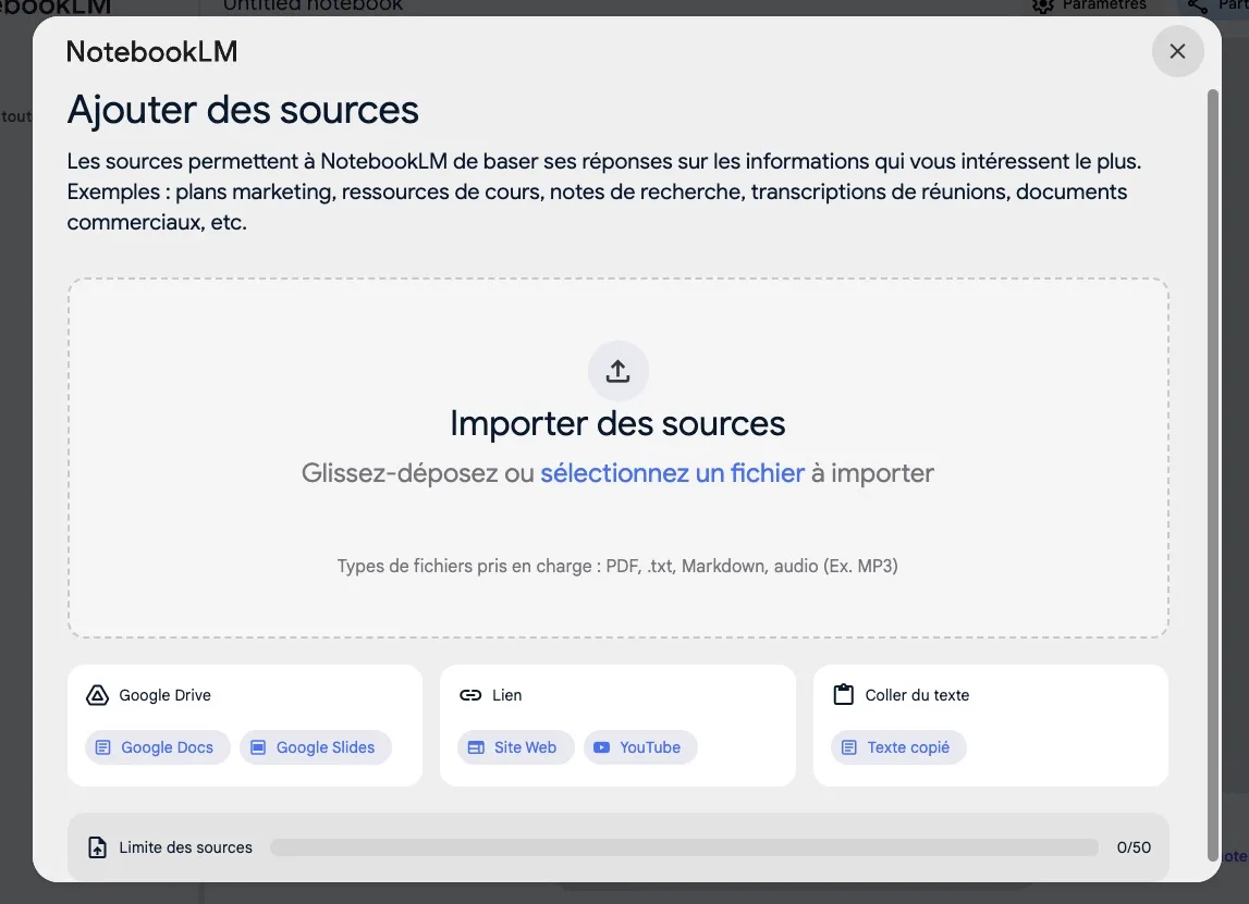 - Sur la page des sources, vous pouvez télécharger vos fichiers, connecter vos documents depuis Google Drive ou coller une URL pour récupérer du contenu.
