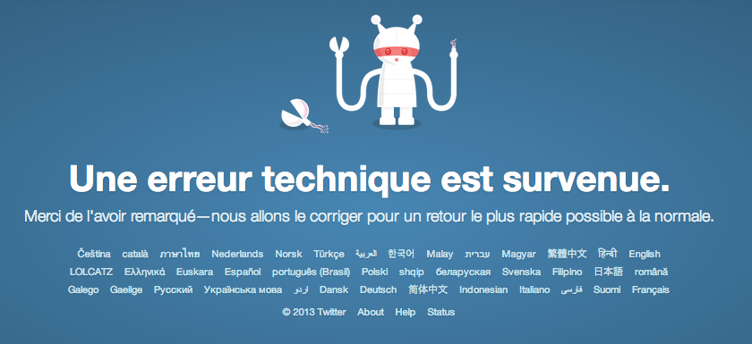 Il semble que Twitter est indisponible pour certains utilisateurs ! Le problème semble avoir commencé vers 22h20 heure locale, puisque c’est à ce moment là que les autres sites de médias sociaux tels que Google+ ont relayé la nouvelle. Le blog de ​​statut de Twitter ne mentionne aucun problème, mais dès que l’on souhaite accéder au site on a l’erreur suivante :