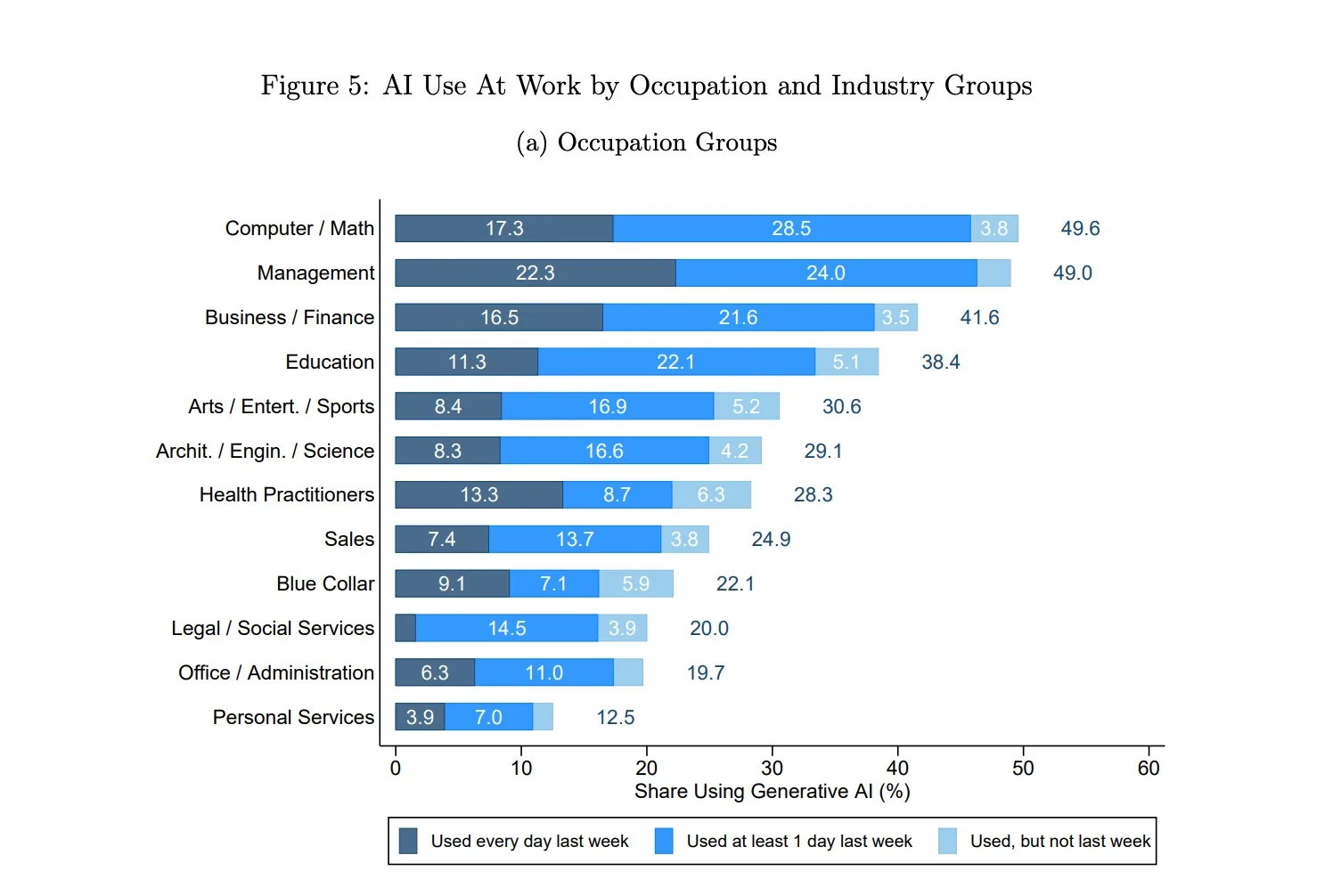 « L’adoption de l’IA générative est plus courante dans les professions de gestion, d’affaires et d’informatique, avec des taux d’utilisation dépassant 40 % », indique l’étude. « Cependant, un “col bleu” sur cinq et un travailleur sans diplôme universitaire sur cinq utilisent également régulièrement l’IA générative au travail ».