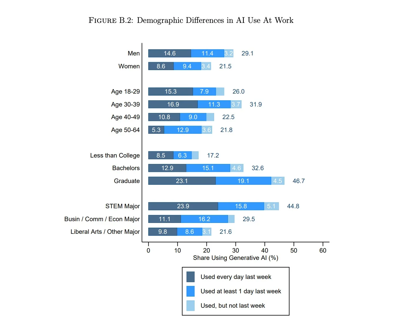 Tout comme la révolution du PC a conduit à une plus grande inégalité au travail, l’adoption de l’IA générative pourrait accélérer cette tendance. L’étude a révélé que les travailleurs plus jeunes, plus instruits et à revenu plus élevé sont plus susceptibles d’utiliser l’IA au travail.