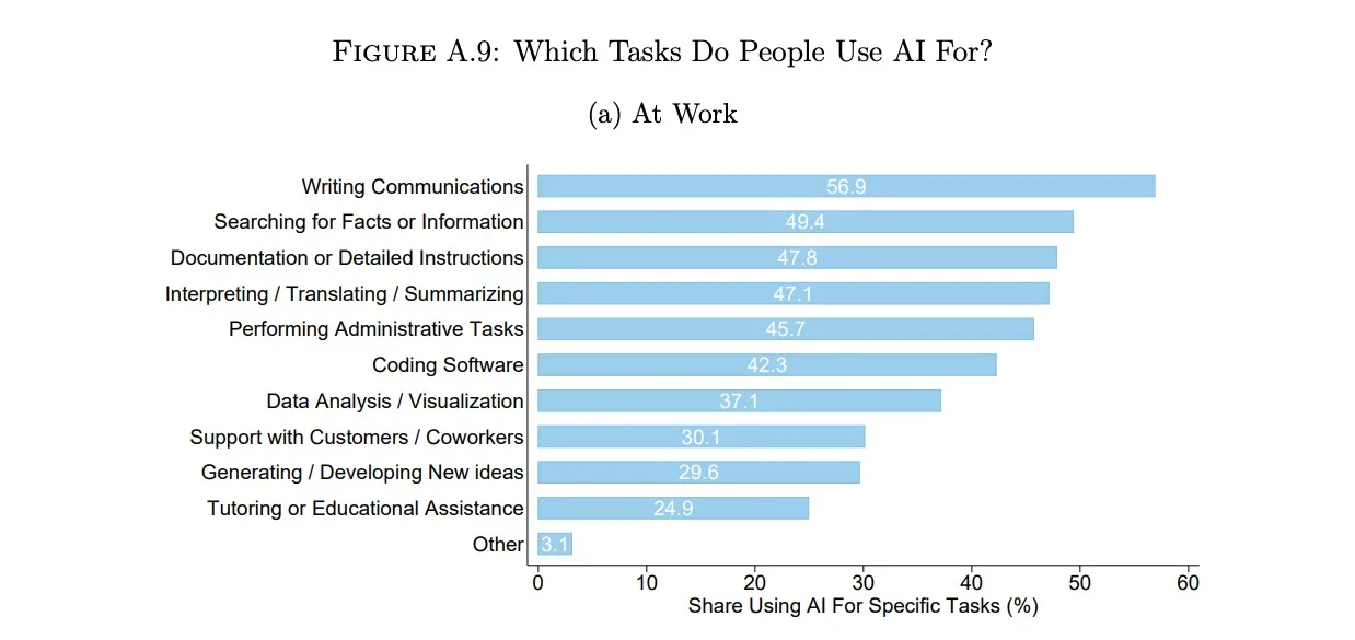Les travailleurs utilisent l’IA générative pour bien plus que la programmation ou le travail technique. Les utilisations les plus courantes de l’IA au travail comprennent la rédaction, les tâches administratives et l’interprétation de textes ou de données. En fait, 57 % des personnes utilisant l’IA au travail ont déclaré l’utiliser pour les tâches de rédaction, et 49 % pour la recherche d’informations.