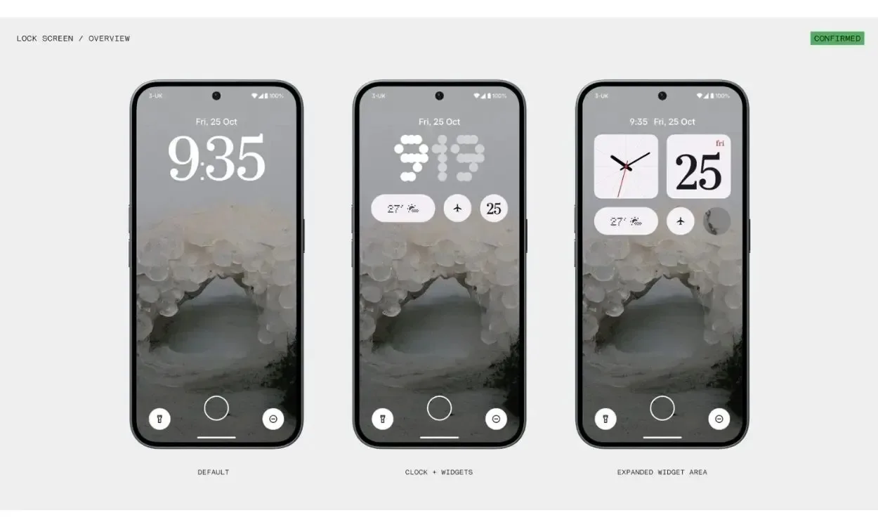 Nothing OS 3.0 offre une personnalisation accrue. L’écran de verrouillage est désormais plus personnalisable. Vous pouvez facilement basculer entre différents styles d’horloge, voire supprimer complètement l’horloge pour utiliser des widgets à la place. De nouveaux cadrans d’horloge sont disponibles, dont un cadran analogique étiré au design unique et élégant.