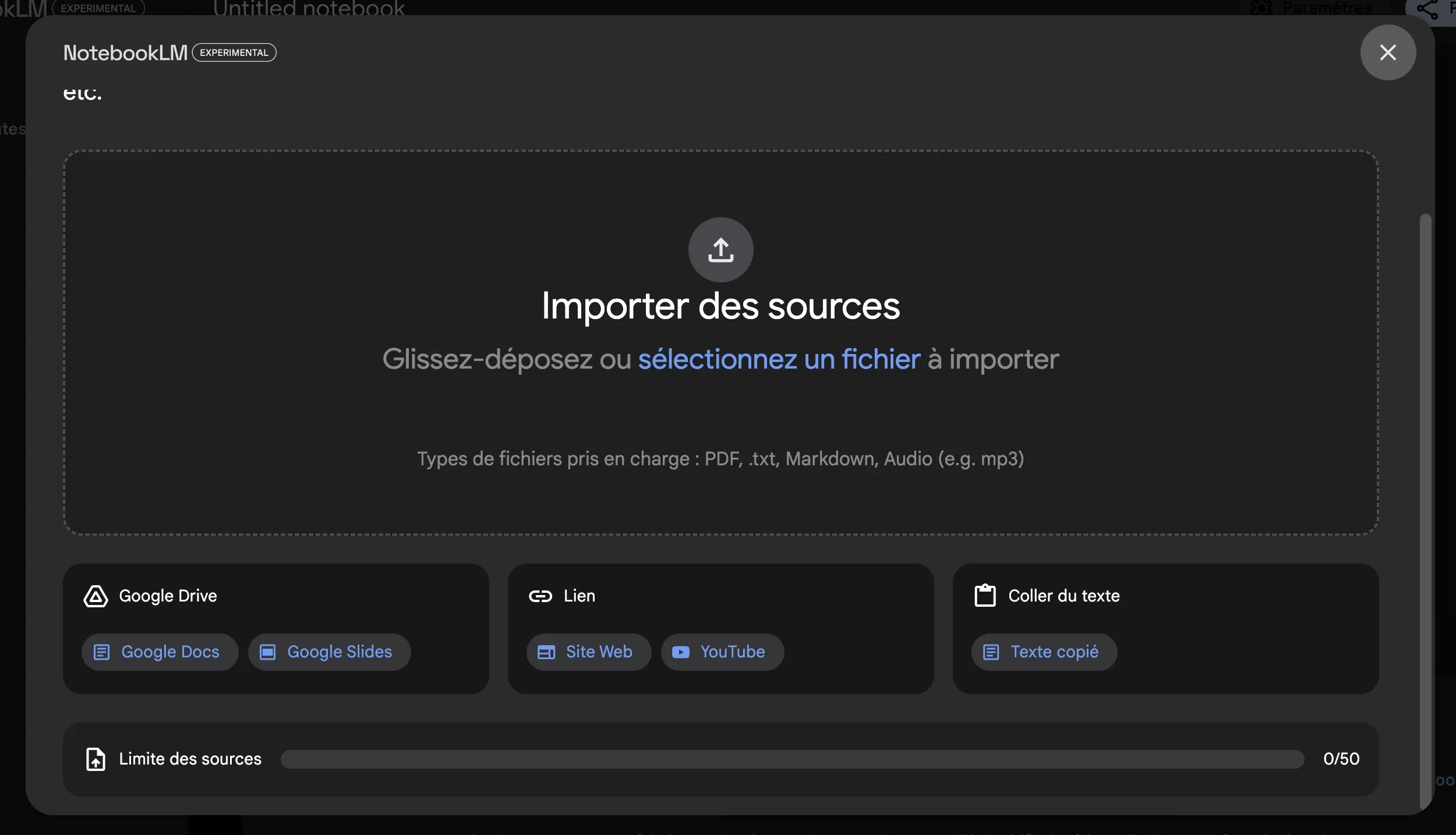 - Dans NotebookLM, cliquez sur « Sources » en haut à droite.