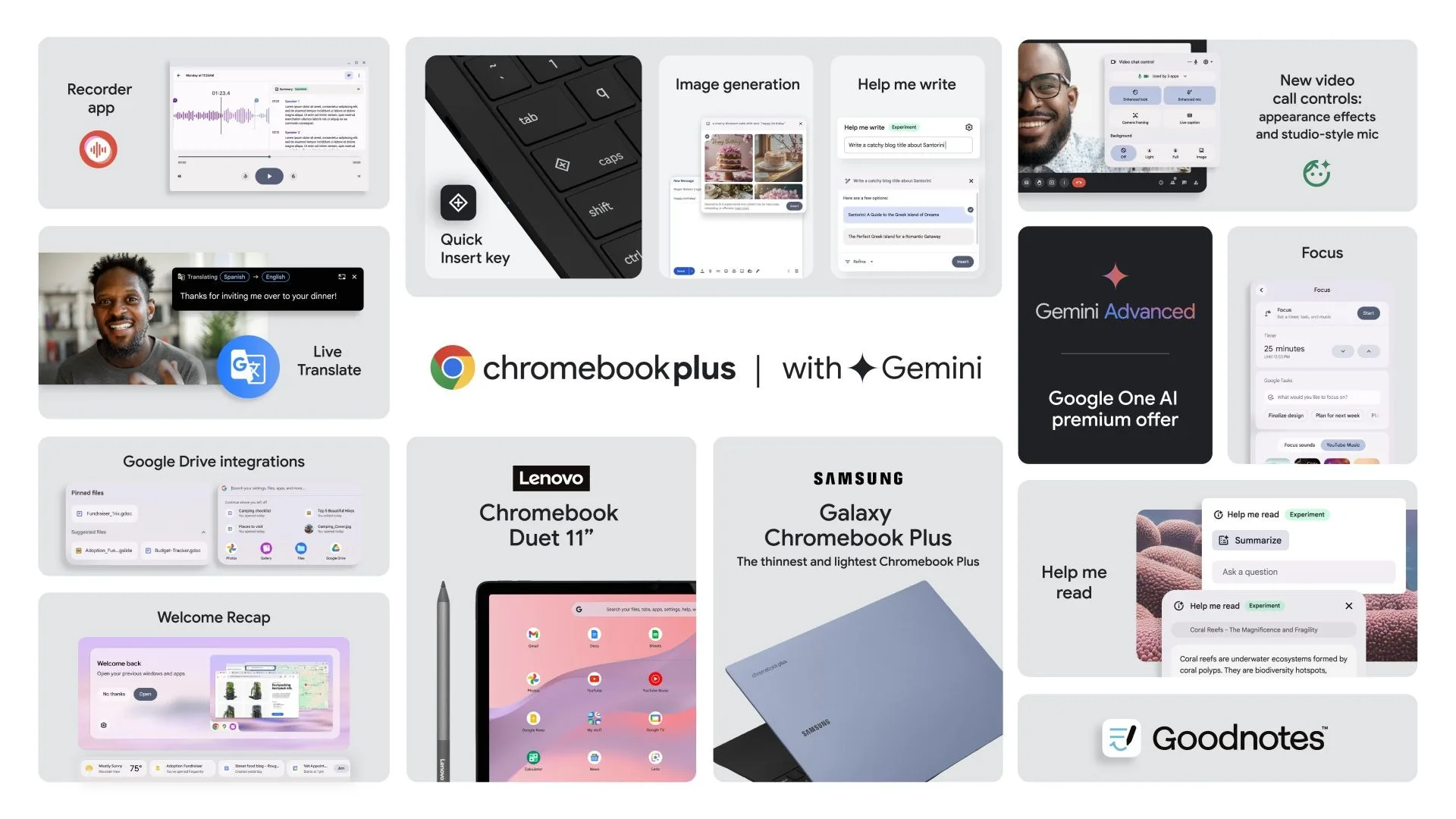 Le Samsung Galaxy Chromebook Plus intègre également une panoplie de nouvelles fonctionnalités basées sur l’IA. Les résumés de PDF générés par l’IA, le chatbot Gemini, la traduction en direct, l’enregistreur, les améliorations des appels vidéo et Recap vous aideront à accomplir vos tâches plus rapidement.