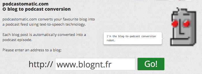 Rendez-vous sur la page d’accueil de Podcastomatic et entrez l’URL du blog que vous souhaitez écouter. Cliquez sur Go lorsque vous avez terminé.