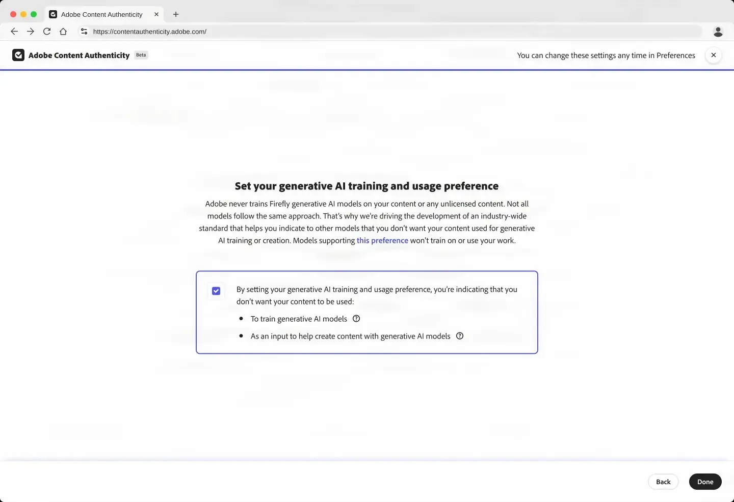 L’application Web Adobe Content Authenticity permettra également aux créateurs de définir des préférences pour empêcher l’utilisation de leurs œuvres par des modèles d’IA générative. Si les modèles d’Adobe ne sont entraînés que sur des contenus sous licence ou du domaine public, ces protections sont conçues pour être appliquées aux modèles d’autres entreprises, à condition qu’elles les prennent en charge.