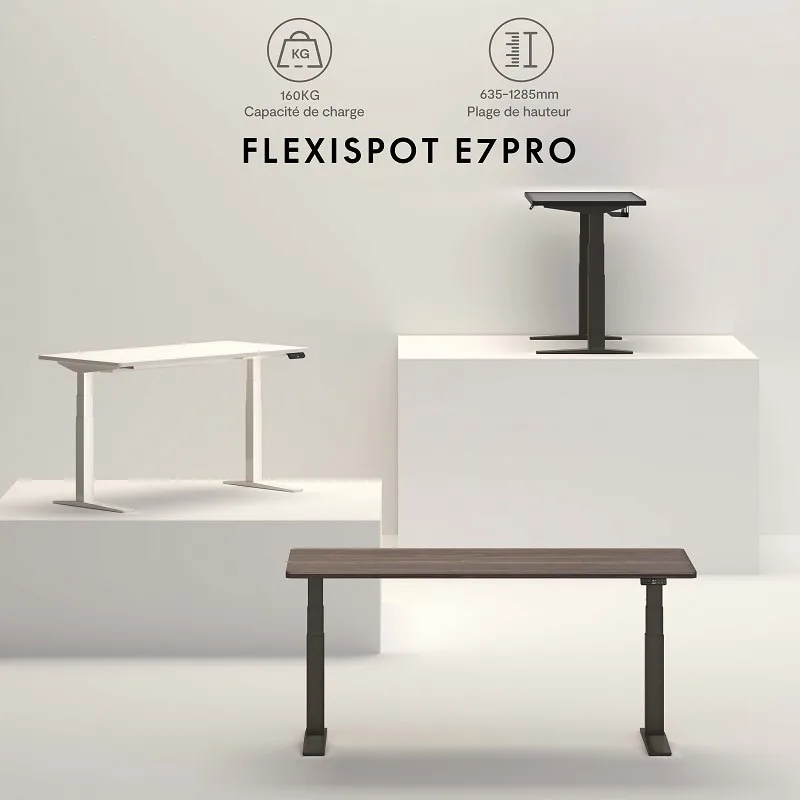 Le FlexiSpot E7 Pro est une amélioration considérable par rapport à la structure standard du E7, apportant une meilleure capacité de charge et une plus grande robustesse, une gestion des câbles plus efficace et une augmentation de la plage de hauteur. V
