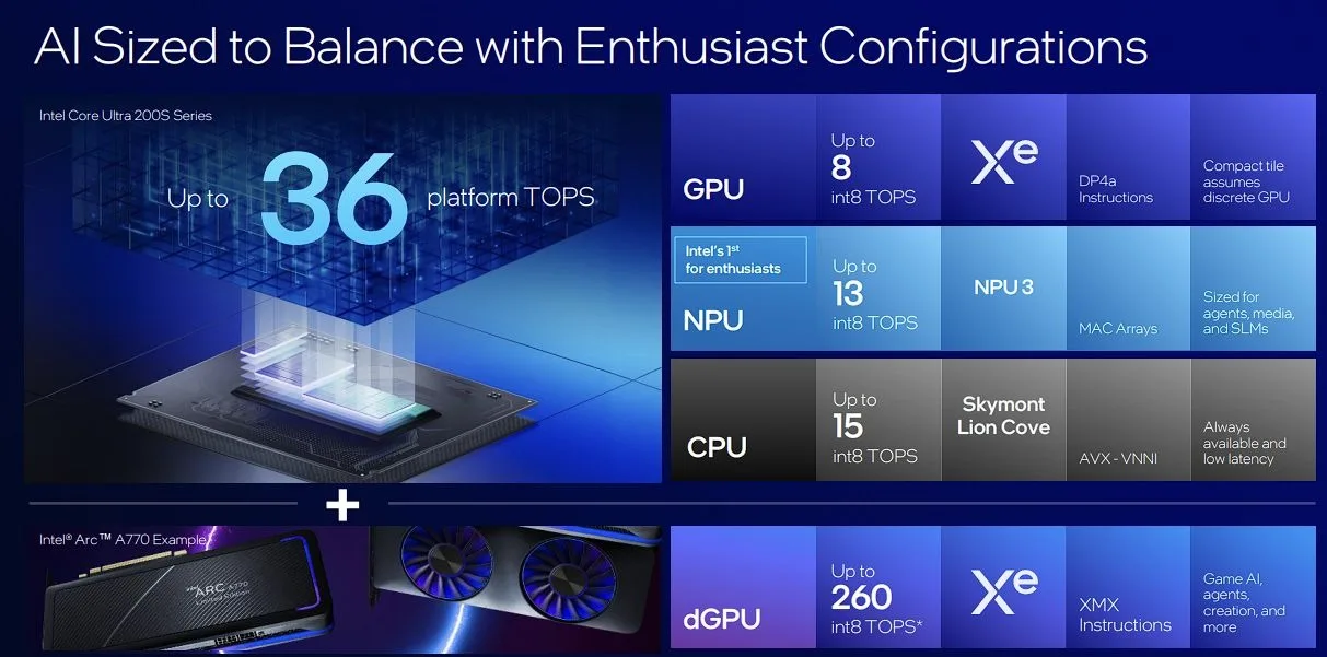 Les processeurs Core Ultra 200S intègrent les dernières technologies de GPU et de NPU d’Intel, mais l’accent est mis sur les performances CPU, les joueurs sur PC étant plus susceptibles d’investir dans un GPU dédié. Bien que ces puces disposent d’un NPU Intel AI Boost et de graphiques intégrés basés sur l’architecture Intel Arc, les versions mobiles (Lunar Lake) offrent des GPU et des NPU plus performants.