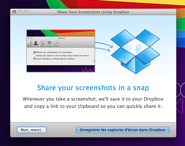 Selon MacStories, cette version de Dropbox peut transférer automatiquement toutes vos captures d’écran prisent dans un dossier Captures d'écran, ou encore partager des fichiers et créer un lien public depuis le presse-papiers du système. Tout ce que vous avez à faire est d’activer la fonctionnalité dans les préférences de Dropbox. Cette fonctionnalité vous permettrait par exemple de partager beaucoup plus rapidement des captures d’écran sur Twitter et d’autres sites et services en ligne.
