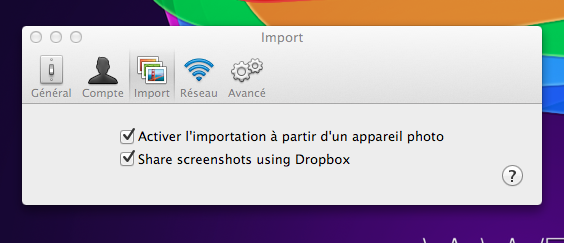La build expérimentale sur OS X a aussi une fonctionnalité d’importation pour iPhoto, permettant ainsi d’ajouter tous les albums et les événements iPhoto au sein d’albums Dropbox visibles sur le web. Ces derniers une fois importés, apparaîtront comme une notification dans le menu de la barre Dropbox si les photos sont téléchargées dans la bibliothèque iPhoto. En revanche, il est important de souligner que cette fonctionnalité est uniquement prise en charge sur Mac avec iPhoto 7.0 ou supérieur.