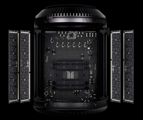 Malgré sa taille toute petite, cela ne signifie pas qu’Apple a laissé de côté les spécifications du matériel. En effet, ce Mac Pro va pouvoir intégrer la prochaine génération de processeur Intel Xeon E5 de douze-cœurs cadencé jusqu’à 3,06 GHz – 4, 6 ou 12 selon votre convenance. “C’est le premier Mac jamais livré en standard avec une double carte graphique”, a déclaré Schiller. Grâce aux cartes graphiques AMD hautes performances, la technologie graphique du Mac Pro permet, avec une solution bi-GPU de deux cartes AMD FirePro, de disposer d’une puissance de calcul de 7 téraflop. Côté stockage, le Mac Pro dispose d’un SSD interfacé en PCI-Express annoncé comme 10 fois plus rapide que les SSD interfacés en SATA 6 Gbps. Enfin, pour la mémoire vive, on va retrouver de la DDR3 avec contrôle d’erreur (ECC) le tout à 1 866 MHz sur quatre canaux pour délivrer une bande passante théorique estimée de 60 Go/s.