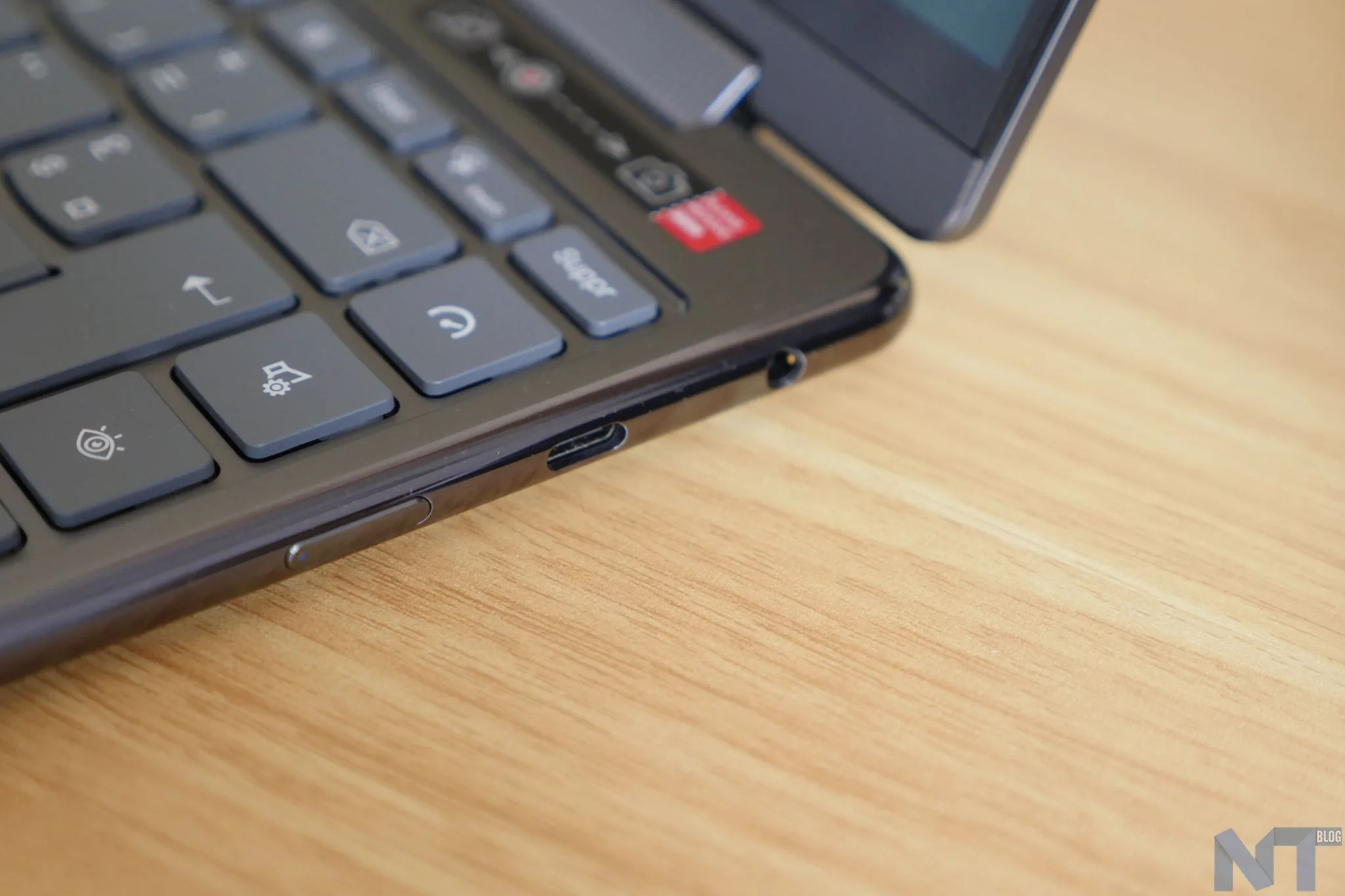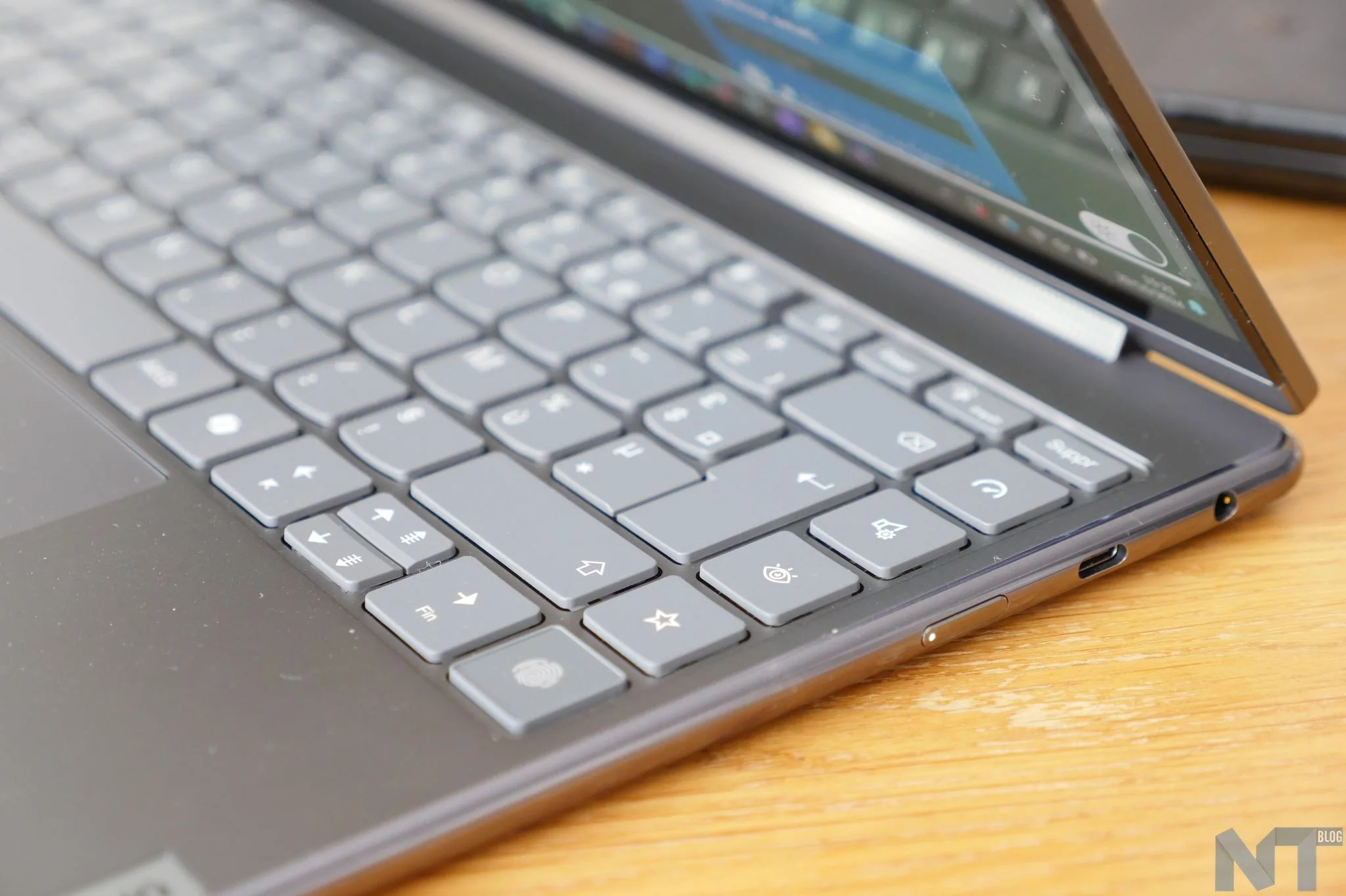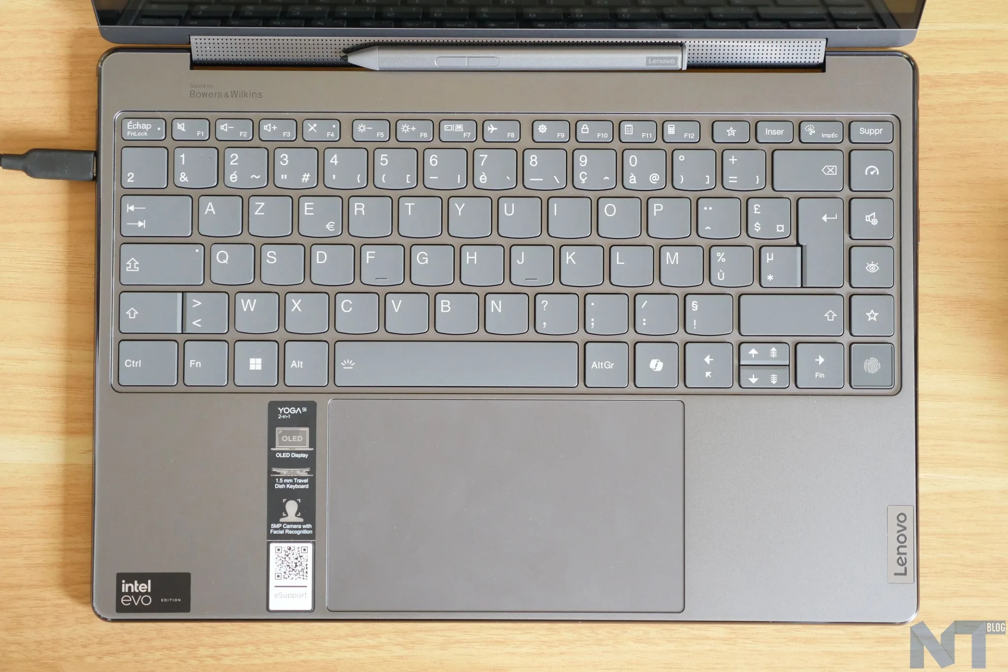 Côté audio, Lenovo conserve la fameuse barre de son rotative intégrée dans la charnière, équipée de haut-parleurs Bowers & Wilkins. Cette barre de son garantit une qualité sonore exceptionnelle, quelle que soit l’orientation de l’écran, avec des basses profondes et des aigus clairs.
