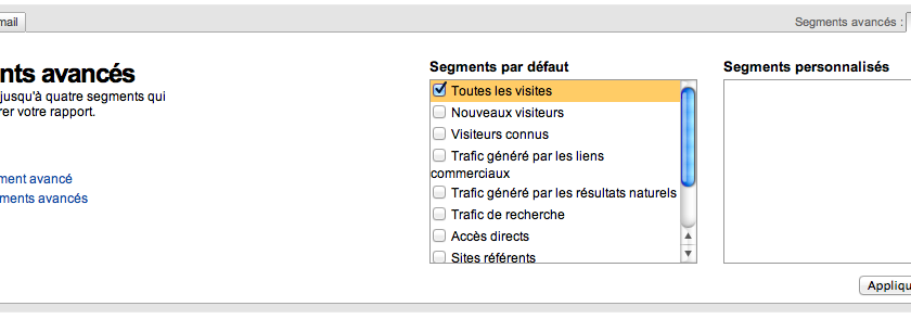 En terme de nouveauté, vous pouvez, maintenant visualiser plusieurs segments avancés sans avoir besoin d’utiliser l’affichage de toutes les visites. La capture d’écran ci-dessous vous présente l’affichage des segments avancées :