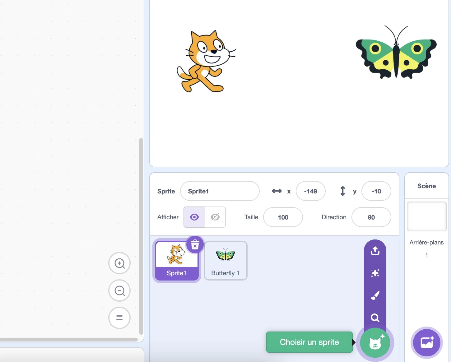 Créer un compte sur Scratch lui a permis de sauvegarder ses projets et d’explorer la communauté de jeunes créateurs. Pour son premier projet, on a choisi une animation simple : un chat poursuivant un papillon. Scratch propose une bibliothèque de sprites (personnages et objets pré-animés) pour enrichir facilement les projets. On a ajouté le papillon en cliquant sur « Choisir un sprite », tandis que le chat est inclus par défaut.