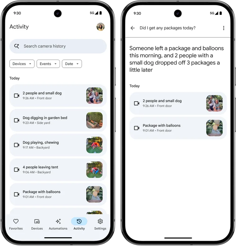 Parmi les nouveautés les plus marquantes, la fonctionnalité appelée Recherche de caméra par IA permet désormais aux caméras Nest de comprendre et d’analyser ce qui se passe dans votre maison. Contrairement aux précédentes versions, où elles se limitaient à détecter des personnes, des colis ou des mouvements, les caméras sont désormais capables d’interpréter des scénarios plus complexes.