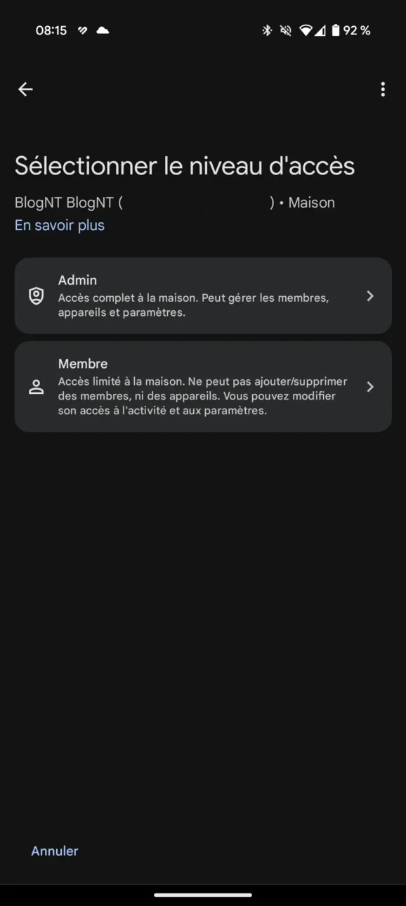 - Accès admin : Destiné aux personnes de confiance qui co-gèrent activement la maison. Les Admins peuvent :