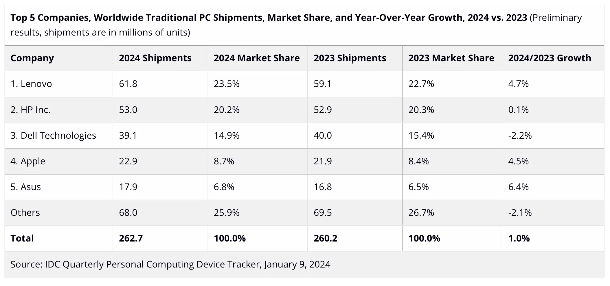 Sur l’ensemble de l’année, les expéditions mondiales ont atteint 262,7 millions d’unités, marquant une hausse de 1 % par rapport à 2023.