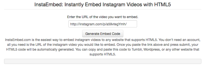 Une fois cette URL, allez sur InstaEmbed afin de générer le code HTML5 pour instantanément intégrer les vidéos Instagram. De là, collez l’URL précédemment copiée, et cliquez sur le bouton “Generate Embed Code”.