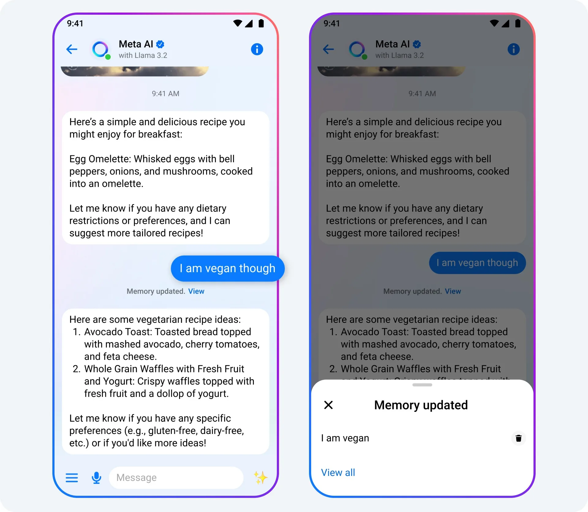 Par exemple, si un utilisateur mentionne dans une conversation qu’il est végan, Meta AI s’en souviendra et proposera des idées de recettes qui correspondent à ce régime alimentaire lors de futures interactions. Cependant, Meta précise que cette capacité de mémorisation ne sera pas active dans les discussions de groupe, et que les utilisateurs pourront à tout moment supprimer les informations mémorisées.